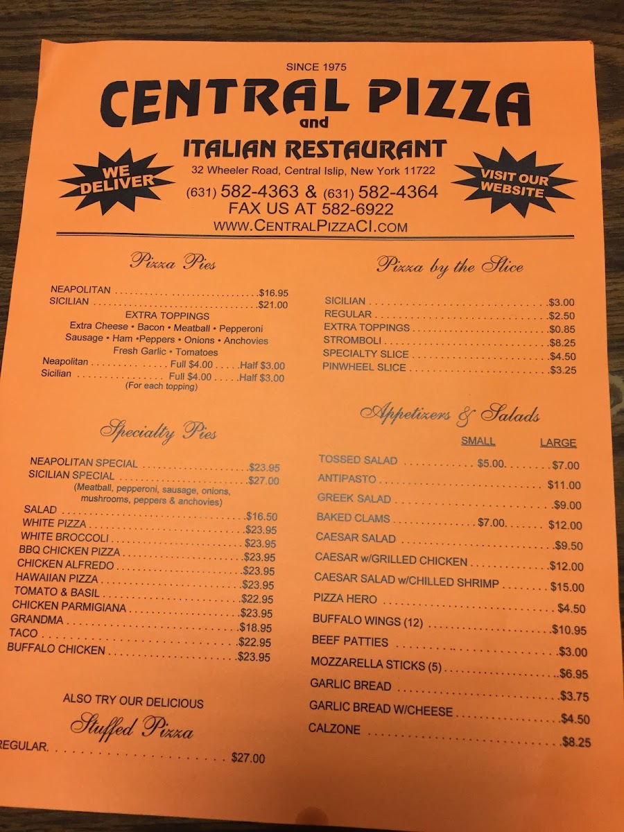 Welcome to Central Pizza - Central Islip, where culinary joy meets exceptional service. Located at 32 Wheeler Rd, this beloved pizzeria offers a menu that tantalizes every palate. Dive into their appetizing appetizers, featuring crispy chicken wings and gooey mozzarella sticks, or savor their delicious garlic knots for just $0.69 each.
